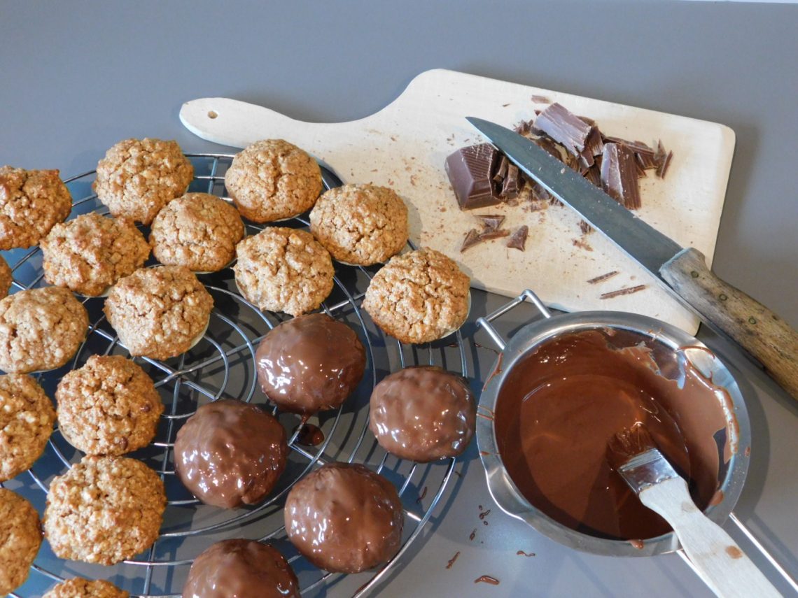 - Die ausgekühlten Lebkuchen mit temperierter Vollmilchkuvertüre überziehen.