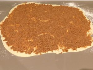 - Den Teig (ca. ½ cm dick) zu einem Rechteck ausrollen und die Füllung gleichmäßig verstreichen.