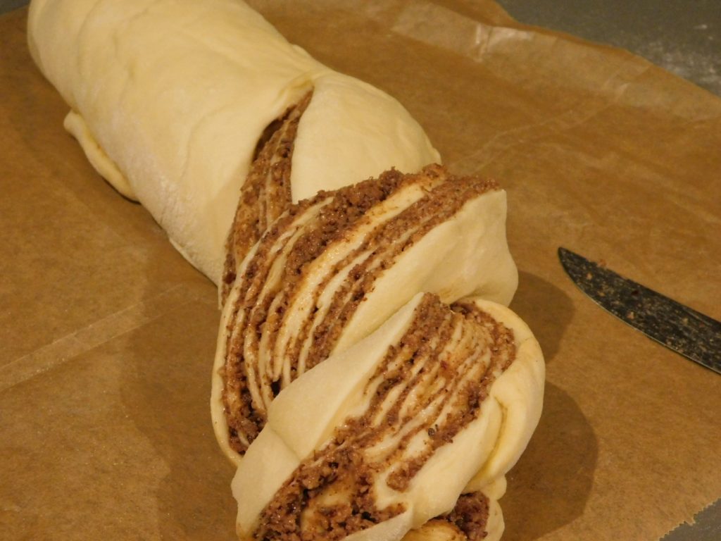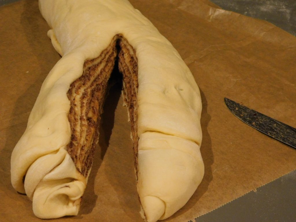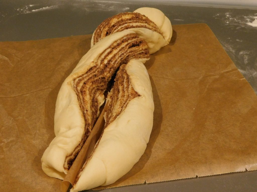 - Die Teigrolle auf ein mit Backpapier ausgelegtes Backblech legen. Von der Mitte aus nach außen aufschneiden und die Teigstränge verdrehen und die Enden gut andrücken. Das Gleich für die andere Seite wiederholen.