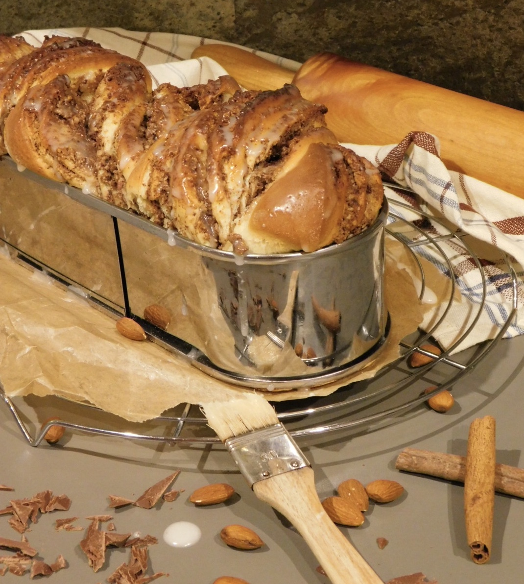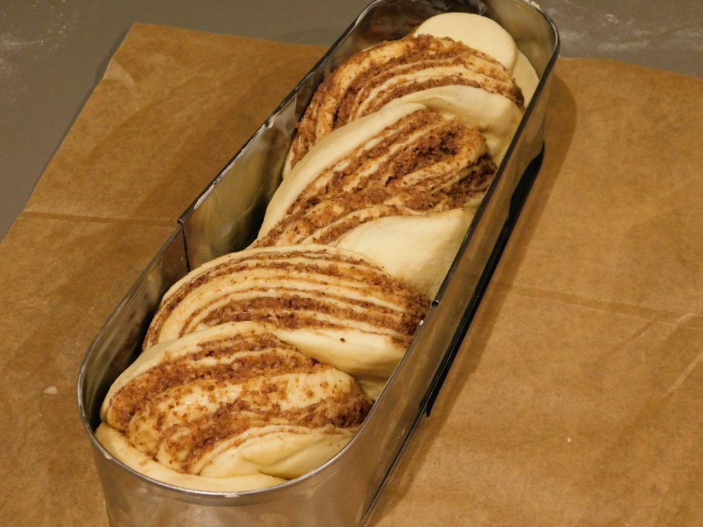 Ich stelle vor dem Backen gerne einen gefetteten Backrahmen um den Nusszopf. Er bleibt dann besser in Form und passt gut unter eine rechteckigen Kuchenhaube. So verpackt lässt sich der Zopf gut transportieren und bleibt einige Tage saftig und frisch.